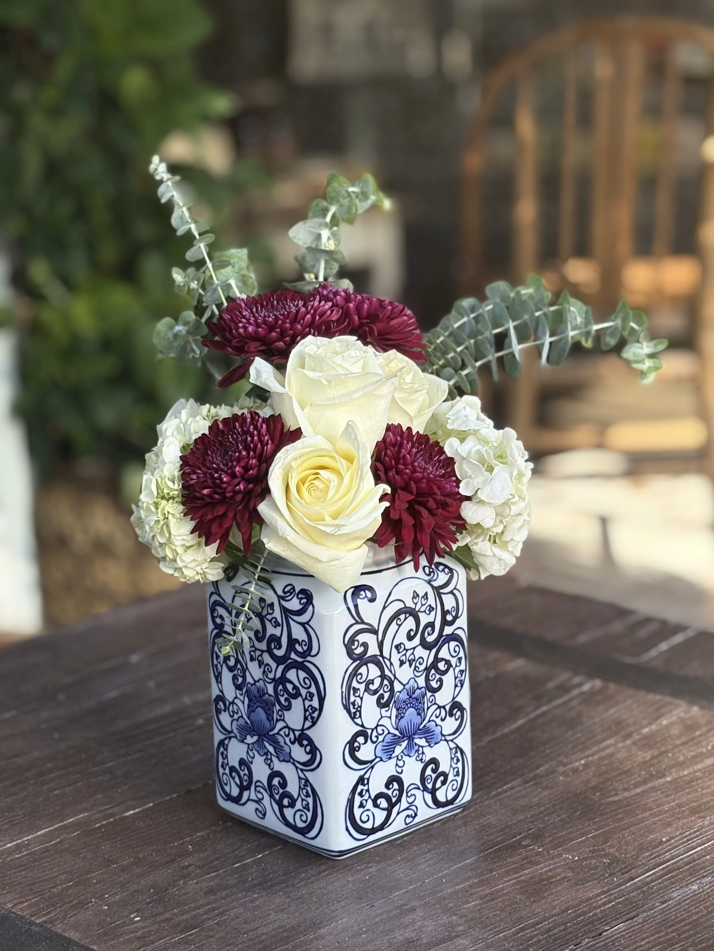 Alicia is the embodiment of grace and timeless beauty. Nestled in a hand-painted ceramic vase inspired by traditional Talavera artistry, this arrangement pairs creamy white roses and soft green hydrangeas with deep burgundy chrysanthemums. The contrast of rich jewel tones and soft neutrals creates a striking harmony. Elegant, refined, and unforgettable.