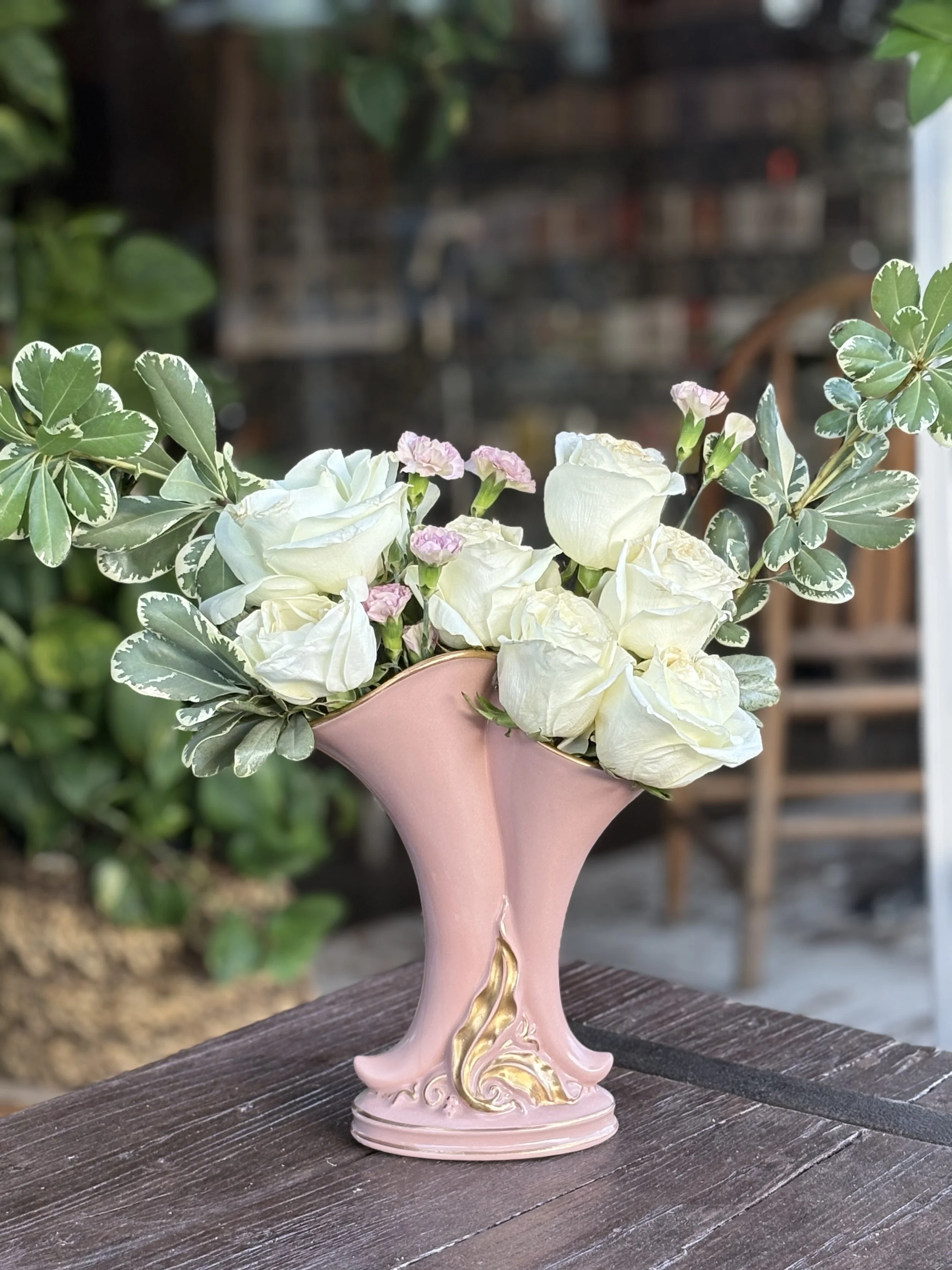 Stephanie is a charming arrangement that blends vintage flair with modern softness. Nestled in a beautifully sculpted, blush pink ceramic vase with delicate gold accents, Stephanie features creamy white roses, dainty pink mini carnations, and lush variegated greenery.