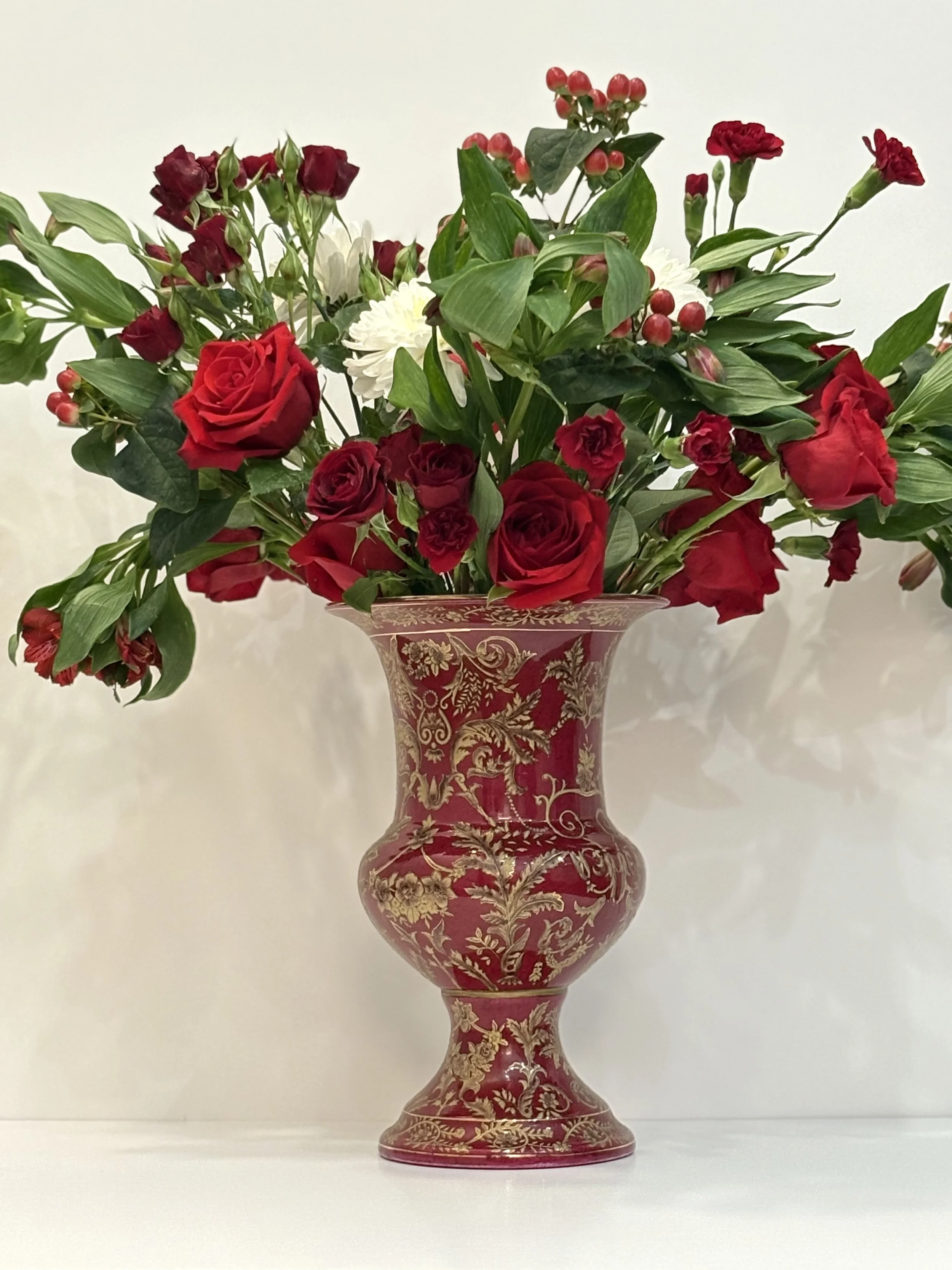 Bold, regal, and unforgettable. Set in an ornate crimson vase adorned with intricate golden patterns, this arrangement radiates strength and elegance. Vibrant red roses and miniature spray roses intertwine with lush greenery, while touches of white blooms add depth and contrast. A statement piece perfect for grand celebrations, meaningful gifts, or simply transforming any space into one of timeless beauty.